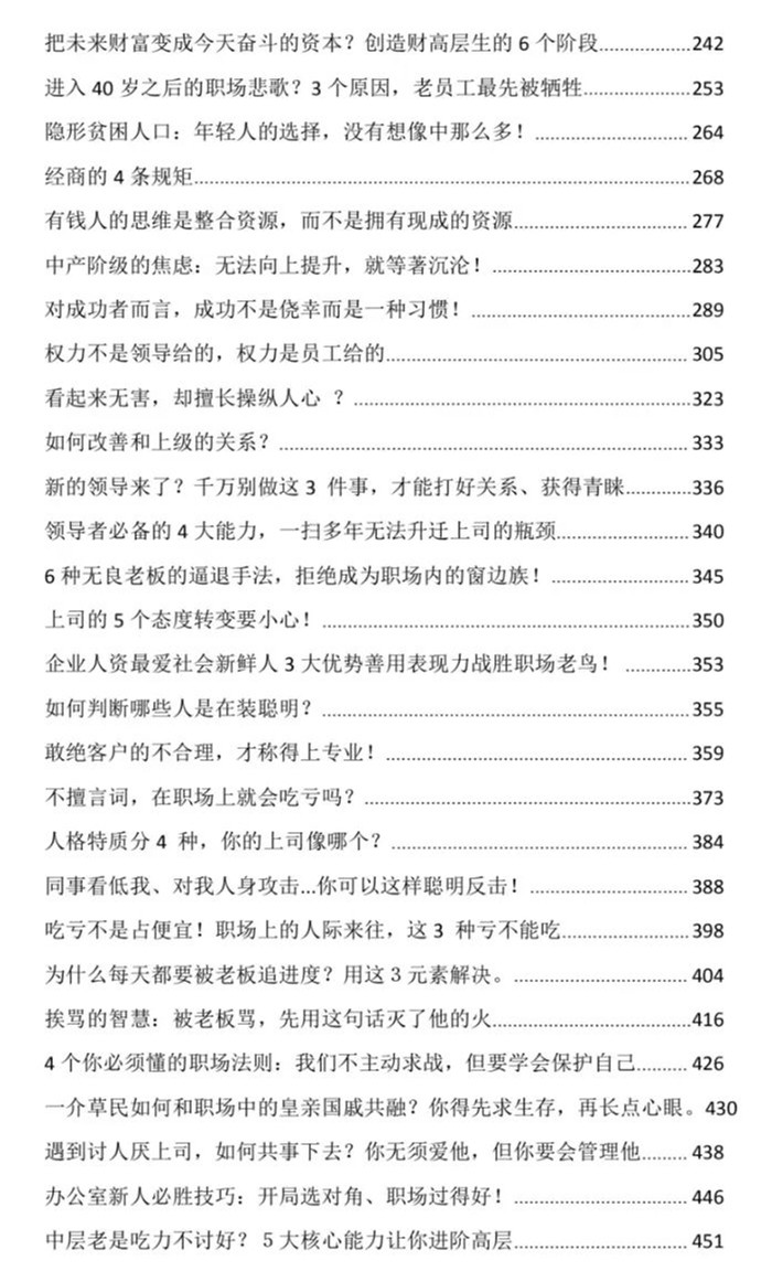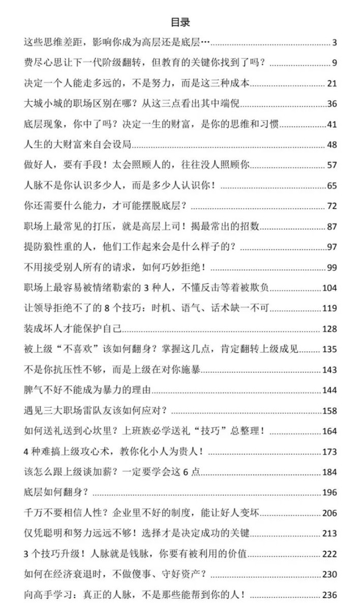 《职场修罗场》PDF 2025-11-03 人性权谋 《职场修罗场》底层逆袭的职场生存博弈术 每天被上司打压、被同事拿捏不懂拒绝还被欺负、升职加薪迷茫没门路 深度拆解,扒开职场阶层跃迁的隐秘逻辑,这本书都能给你答案! 如果你的收入和别人一样,而你花费的时间只有别人的一半,那么也就意味着你的边际收益更高,你才算真的富有。 边际成本意识不单单可以用在庞大的商业模式上,还能够具体指导我们工作中面对的每一个问题。 它的宗旨只有一条,即如何把有限的时间,最大可能进行复制。 资源下载下载价格10 爱坤币VIP免费升级VIP立即购买获取电子书 请添加微信:pc16616 获取电子书 请添加微信:pc16616 获取电子书 请添加微信:pc16616
