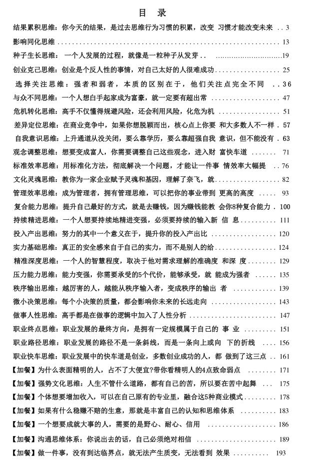 《高手成事思维》PDF 2025-11-21 人性权谋 结果累积思维:你今天的结果,是过去思维行为习惯的积累,改变习惯才能改变未来! 你今天的结果,是过去思维行为习惯的积累,改变习惯才能改变未来。 很多人都认为自己的命运是不可控的,其实这是不对的,你的命运是由你做出的无数个选择而影响决定的。 不过,我们大多会按照自己熟悉的方式去选择。 而这种熟悉的方式,也就是我们的思维习惯、行为习惯,就像代码一样深深影响着我们,深深控制着我们… 资源下载下载价格10 爱坤币VIP免费升级VIP立即购买获取电子书 请添加微信:pc16616 获取电子书 请添加微信:pc16616 获取电子书 请添加微信:pc16616