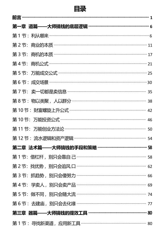 《大师搞钱系统》PDF 2025-12-02 人性权谋 很多朋友都想赚钱、想发财 ,但你总得先搞清楚,钱到底从哪来吧? 很多人会说“钱是赚来的”,这话太笼统了。 从本质上讲,利益的来源其实有三种:被赠予、掠夺和交换。 “拿你有的,换你想要的”,这就是我们所有赚钱、获取利益的核心逻辑。 钱不是“赚”来的,本质上是“换”回来的。 资源下载下载价格10 爱坤币VIP免费升级VIP立即购买获取电子书 请添加微信:pc16616 获取电子书 请添加微信:pc16616 获取电子书 请添加微信:pc16616