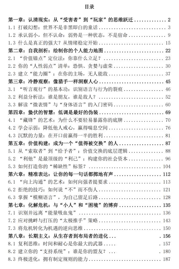 《弱者进化手册》PDF 2025-12-07 人性权谋 《弱者进化手册》——弱势者的逆袭法则 世界从不公平,但你可以更聪明地生存! 思维跃迁:从”受害者”到”玩家”的认知升级 蛰伏智慧:藏锋守拙,在沉默中积蓄力量 价值重构:打造你的稀缺性,成为必选项 危机转化:用太极思维化解打压与挑衅 教你:弱势时如何低调成长、逆风局如何精准破局、长期主义者的布局思维。 弱小是起点,不是终点——进化才是终极答案! 资源下载下载价格10 爱坤币VIP免费升级VIP立即购买获取电子书 请添加微信:pc16616 获取电子书 请添加微信:pc16616 获取电子书 请添加微信:pc16616