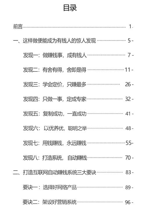 《互联网赚钱心法》PDF 2025-12-28 创业赚钱 《互联网赚钱心法》是一本浓缩实战经验的财富指南! 书中拆解8大赚钱发现、3大核心要诀与完整赢利流程,从产品选择、营销系统架设到推广变现,全是可直接落地的干货。 拒绝复杂理论,聚焦“卖产品赚大钱”核心,教你精准定位、高利润定价、建立终身顾客联系,用销售信、自动化流程实现“一次搭建,持续盈利”。 不管是新手还是创业者,都能跟着步骤打造专属赚钱系统,从轻松月入到财富倍增,解锁互联网赚钱的底层逻辑与捷径。 资源下载下载价格10 爱坤币VIP免费升级VIP立即购买获取电子书 请添加微信:pc16616 获取电子书 请添加微信:pc16616 获取电子书 请添加微信:pc16616