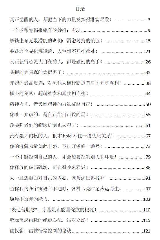 《觉醒内核力量》PDF 2026-01-19 人性权谋 《觉醒内核力量》停止向外追逐认可,才发现内核里藏着最稳的底气。 在我看来内耗、焦虑的本质:就是自己在和自己打架,自己和自己没法好好相处。 宇宙接收到的信号就会是:你如此的关注你讨厌的东西,你如此的愤怒那些让你不爽的人事物。 既然讨厌和愤怒的能量你这么高频的提起,就说明你需要。 那就不停的给你输送更多这样的能量,而这恰好生成了我们指责抱怨,和也像家人那样一出问题就找别人问题的习气。 也就是说,显化是由内在频率决定的。 资源下载下载价格10 爱坤币VIP免费升级VIP立即购买获取电子书 请添加微信:pc16616 获取电子书 请添加微信:pc16616 获取电子书 请添加微信:pc16616