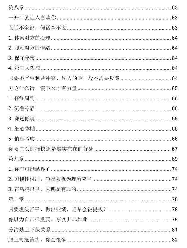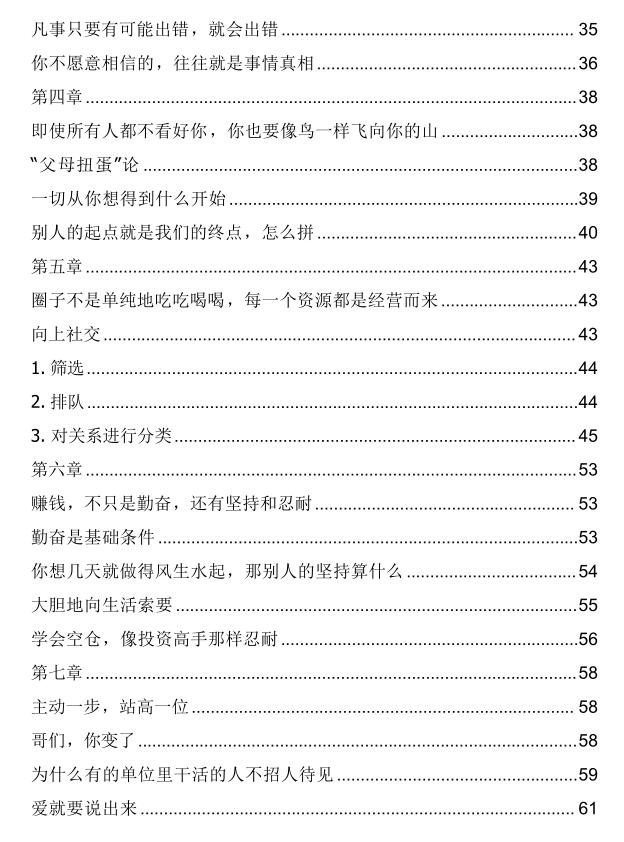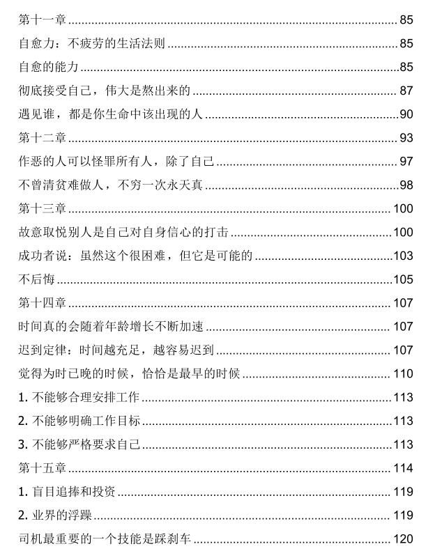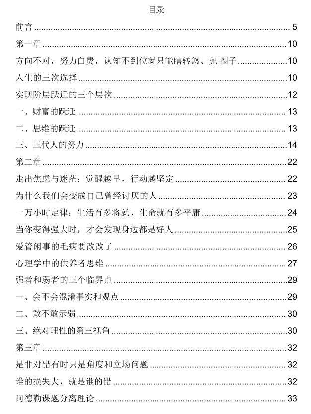 《反人性生存术》PDF 2026-02-25 人性权谋 《反人性生存术》心理学上有个专业词语叫“区分”,哪些是自己的事,哪些是别人的事,哪些是老天的事。 有的人没有边界,没有立场,整个生活一团糟。 操着老天的心,操着别人的心,然后抱怨自己,把自己变成受害者。 真正厉害的区分是什么呢?我把你的命运还给你,以平常心应无常事。 不喜欢你的人你变得再漂亮,穿得再华丽,他还是不喜欢你。 看不起你的人你变得再优秀还是看不起你。 你需要的,只是内心强大而已。 资源下载下载价格10 爱坤币VIP免费升级VIP立即购买获取电子书 请添加微信:pc16616 获取电子书 请添加微信:pc16616 获取电子书 请添加微信:pc16616