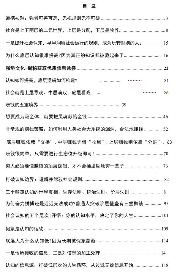 《规则与觉醒》PDF 2026-03-11 人性权谋 《规则与觉醒》当你了解了分配层与牧养层的二元世界,你就会明白自己不过是亿万被饲养的动物中的一员。 可惜的是, 一个人在底层沉沦之后,是很难被唤醒的,他自己也不愿意醒来。 而想要跳出牧养层的人,只有两种途径。 一是提升社会认知,早早洞察社会运行的规则,成为玩转规则的人; 二是舍弃自我,开始学习牧养的技术,而非做被饲养的动物。 唯有如此,才有可能实现人生的逆袭。 资源下载下载价格10 爱坤币VIP免费升级VIP立即购买获取电子书 请添加微信:pc16616 获取电子书 请添加微信:pc16616 获取电子书 请添加微信:pc16616