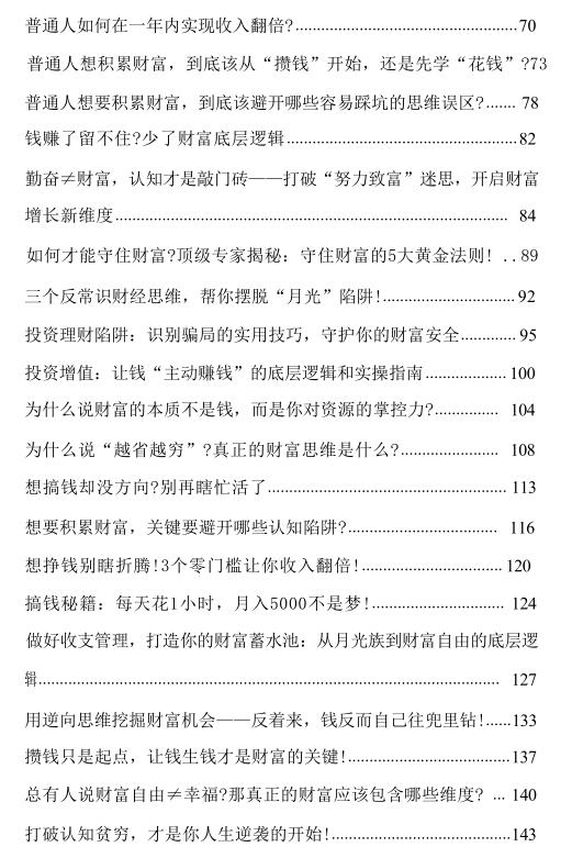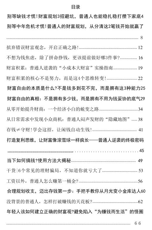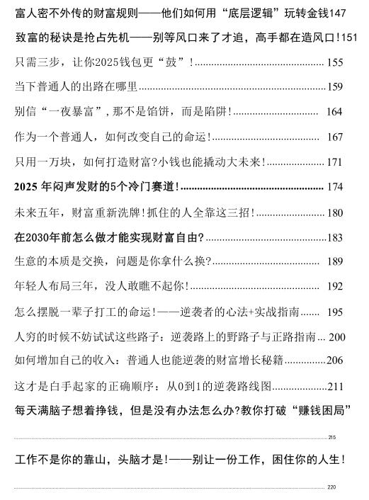 《财富蓄水池》PDF 2026-03-30 创业赚钱 《财富蓄水池》财富的本质从不是数字堆砌,而是认知与资源的掌控力。 从强制储蓄筑牢根基,到资产配置稳健增值,再到复利思维撬动长期收益,普通人的财富逆袭,藏在每一次理性选择里。 摒弃“一夜暴富”幻想,避开消费主义陷阱,用自律对抗人性弱点,让时间成为盟友。 真正的财富自由,是拥有不为钱妥协的底气,和掌控生活的从容。 资源下载下载价格10 爱坤币VIP免费升级VIP立即购买获取电子书 请添加微信:pc16616 获取电子书 请添加微信:pc16616 获取电子书 请添加微信:pc16616