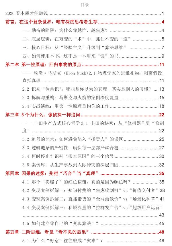 《2026看本质才能赚钱》PDF 2026-03-31 创业赚钱 《2026看本质才能赚钱》2026年想赚钱,别再困于低水平忙碌,别再盲目追风口学套路! 这本书直击财富核心,从第一性原理、5个为什么到复利效应、长期主义,用12大核心思维模型,教你穿透商业表象抓本质,跳出勤奋陷阱,构建自己的赚钱算法。 拒绝纸上谈兵,全是可落地的实战方法与案例,从思维升级到30天变现计划,手把手带你从“知道”到“做到”,让认知落地为财富,2026年做赚钱的深度思考者! 资源下载下载价格10 爱坤币VIP免费升级VIP立即购买获取电子书 请添加微信:pc16616 获取电子书 请添加微信:pc16616 获取电子书 请添加微信:pc16616