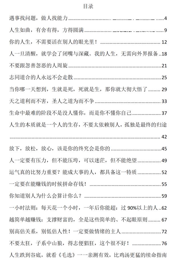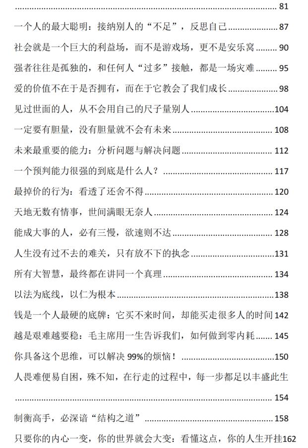 《成事之法》PDF 2026-04-05 人性权谋 钱这东西,年轻时觉得俗。谈钱伤感情。上了年纪发现,大部分感情的伤,是因为没钱。 不是学好了再干,而是干起来再学,干就是学。 能给带来利益,人性就是善良的。没有了利用价值,人性就是自私的。 人在低谷最怕什么。最怕觉得这日子没个头。 欠了钱,觉得这辈子还不清。 丢了工作,觉得再也找不到像样的。 被人瞧不起,觉得这辈子就这么完了。 这种时候,满脑子绝望。看什么都是黑的。 很多人倒霉,不是被别人干趴下的。是被自己折腾死的。 资源下载下载价格10 爱坤币VIP免费升级VIP立即购买获取电子书 请添加微信:pc16616 获取电子书 请添加微信:pc16616 获取电子书 请添加微信:pc16616