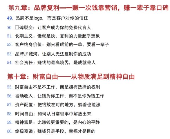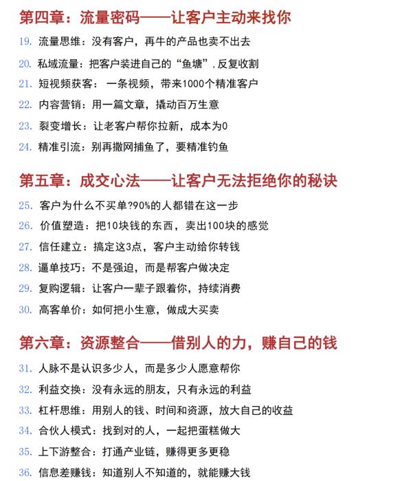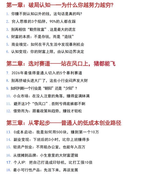 《商道》PDF 2026-04-26 人性权谋 人与人之间的财富差距,本质上就是认知差距。 富人永远在提升认知,普通人永远在消耗时间,这就是最残酷的现实。 你看着别人轻松抓住商机,自己却只能埋头做体力活,不是你不够努力,而是认知层级不同,看到的世界完全不同。 同样是刷短视频,有人看到的是娱乐消遣,有人看到的是流量商机;同 样是逛市场,有人看到的是商品,有人看到的是供需缺口。 认知差带来的信息差,就是最直接的财富差,这不是玄学,是商业世界最真实的规则。 资源下载下载价格10 爱坤币VIP免费升级VIP立即购买获取电子书 请添加微信:pc16616 获取电子书 请添加微信:pc16616 获取电子书 请添加微信:pc16616